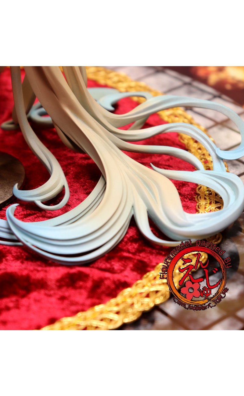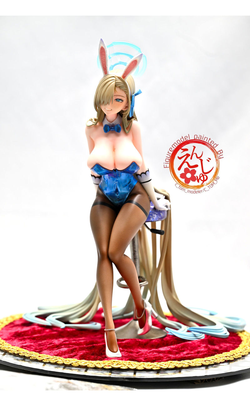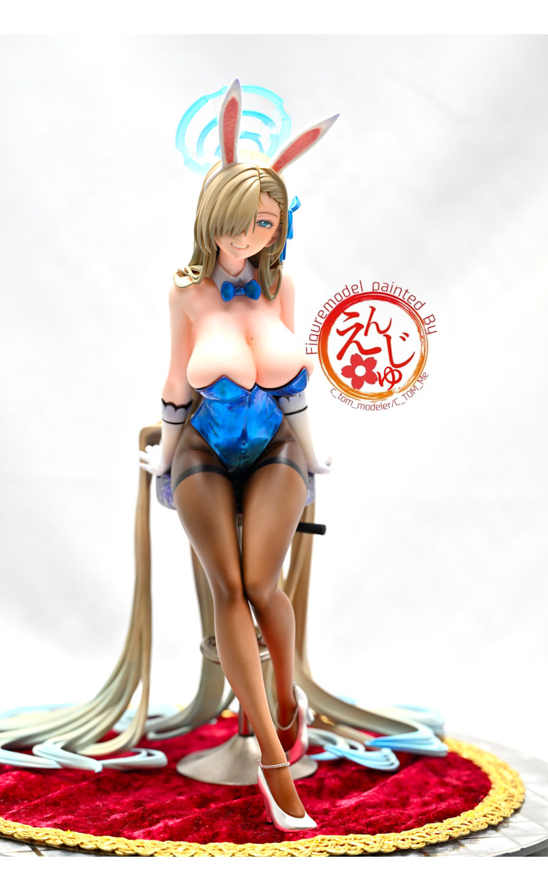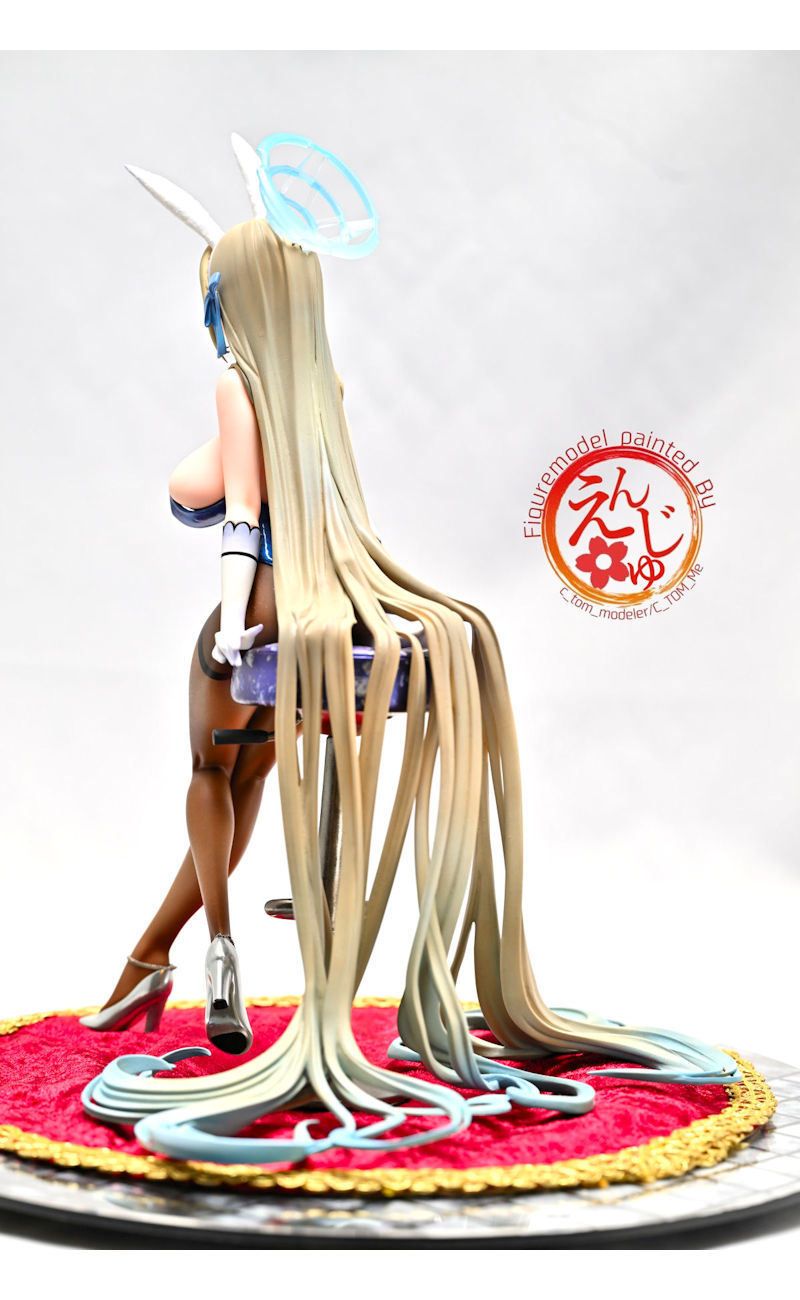コメント: ブルーアーカイブのキャラを一つ作ってみたくて2022冬のWFでキットを入手しました。現地で見た時はそれほど感じませんでしたが、仮組みしたら縦にも横にもでっかい! 製作は大変でした(面積的な意味で)。 大きいので展示会映えするのですが運搬が大変。台座が直径30cm、高さもうさ耳のせいで30cm近くあります。 バニーガールスタイルのアスナはバニースーツの塗り方でフィニッシャーの個性を出すのがお約束のようなので、自分なりに力を込めてみました。 エナメル素材を意識して光沢を出し、グリーンの偏光っぽいブルーで塗っています(画像①参照)。 今まではバニーガールを作る度、うさ耳の質感の出来が今一つで不満でした。今回はそれを解決すべくうさ耳パーツと尻尾パーツをフロッキー加工してみました。 が、展示会でここに言及する人は誰一人おらずちょっとガッカリ(画面②参照)。 毎度、靴の作り方にはこだわっています。アスナのパンプスはキラキラにメタル感を持たせたいと思ったので靴自体をメタリックに塗り、リアルのチェーンでアンクレットを付けてみました。 手芸店で購入したシルバーの細チェーンをちょうどいい長さに切り、両端にステンレス線を捻じって付けて穴を空けた脚パーツに差し込んでいます(画像③参照)。 その他苦労した点と言えば、アスナの長グローブって模様が入ってる(画像④参照)んですが、このキットは模様のモールド等何も入っておらずツルツルでしたので基本的にマスキングで何とかしました。 マスキングだけでは模様の繊細さが出せなかったので適宜筆でリタッチしています。 前述した巨大な台座については、直径30cmのアクリル円板に蛇紋塗装を施して床面を製作し、円形の布に金ブレードを縫い付けて作った赤じゅうたんを床面の中心部に貼り付けて作っています(画像⑤参照)。 よく間違えられるのですが赤じゅうたんは既製品ではなく自作。アクリル円板はネットで探しまわってこのサイズを見つけました。こんな大サイズの台座を作ったのは初めてでした。 目入れはアスナのイメージを壊さないよう基本的に設定に準拠しつつ、大人っぽくて可愛らしい女性を自分なりにイメージして入れてみました(画像⑥参照)。 技術的に特別な方法は用いていません。タミヤエナメルの筆塗り+部分的にエアブラシを使用しています。 総括: 床まで届く長い髪が足元に広がるというボリューミーなデザインは本当に大変でした。当初、その困難さに気付かず無計画に作業を進めてしまって、作業が進むほど難易度が上がってしまいました。 もっとよく考えて作業に当たればよかったな…と思います。 この作品、展示会では目立つらしくよく声をかけられました。印象的なのはカメラマンの方が超ローアングルで撮影されていたこと。このプロポーションですし納得ではあります。 加えて、拝んでくださる方も現れました。エロはやっぱり地球を救うのかもしれません(?)。 |