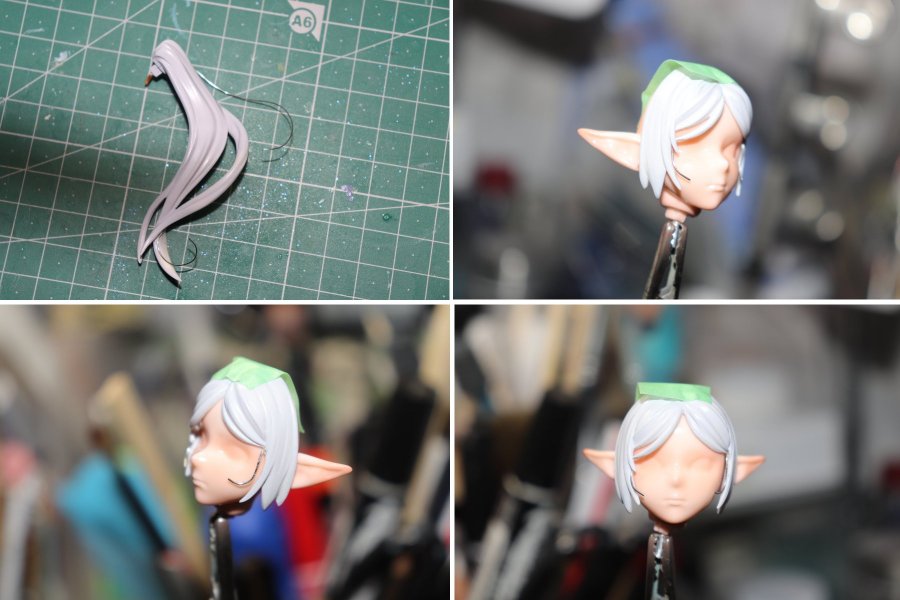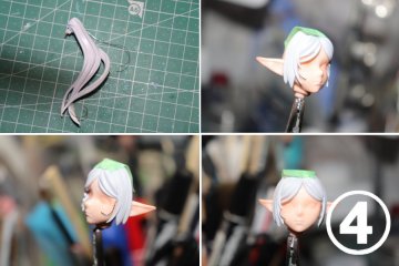 コメント: 2023夏のWFで購入したキットです。当初はフリーレンのことを全く知らなくて事前知識ゼロで卓の前を通りかかったんですが、何て言うか…憂いを含んだ風情を感じたんですよね。で、こういう出逢いこそWFじゃないかなと。 購入後に色々知って、蒼月草の花畑に彼女を立たせたい、花輪も頭に乗せたい、とイメージに突き動かされて作りました。 一目見てわかる通り、コミックスやアニメとは多少異なる顔つきになっています。目のデザインを若干リアル系に振っているのはその方が映えると判断したため。 フリーレンって基本無表情なキャラですが、それを敢えてこのフィギュアに写し取る動機を感じませんでした(そこは個人的な好み)。加えてヒンメルの象徴である蒼月草を持っていることから ・情緒を感じる ・哀愁を感じる ・ただし抑え気味に(涙は演出過多と判断) という雰囲気を持たせたフィギュアにしようと決めました。それを実現するためなら原作に必ずしも似ていなくてもアリだと考えました。 このフリーレンを作るにあたり蒼月草は不可欠です。手に持った花束はキットに3Dプリントパーツが付属していましたが、固さを感じさせないものにしたいと考えてペーパークラフトの花に置き換えることにしました。 台座に植えた蒼月草や頭の花輪もペーパークラフトです(画像①参照)。 困ったのは蒼月草のデザイン。はっきりした設定画が見つからず、結局キキョウを基盤に自分でデザインしました。 台座は木製の円形ベースを用意し、地面や下草を貼り付けた上で蒼月草を多量に植えることにしました。まず地面ですが、軽量タイプの紙粘土(ダイソー)を薄く伸ばして貼り付け、ファレホで着色して表現。 次にフリーレンの立ち位置を決めてその周囲に蒼月草を植え込んでいきました。蒼月草を植えながらスカスカな印象にならないよう地面に下草を貼り付けました(画像②参照) 頭上の花輪は造花用グリーン線をベースにし、蒼月草や差し色になる花を差し込んで作りました。グリーン線はスチール製なのでフリーレンの頭にネオジム磁石を埋め込んで固定しています。 個人的に靴を塗るのを毎度とても楽しみにしています。フリーレンの革製のブーツは特に質感表現に力を入れて作りました(画像③参照)。 茶系のカラーリングは下地にレドーム→クリアブラウン上掛け→クリアブラックで調整、と3色使っています。ラストにウィノーブラックで各所を締めました。質感は複数種類のつや消しクリアを様子を見ながら重ね吹きして調整。 最後にゴールドをエイジングしたネイルパーツをビットに見立てて貼り付けました。 その他の工夫としては髪の筋をステンレス線で足したり(画像④参照)、ピアスをクリアパーツに置き換えたり(画像⑤参照)しています。ピアスはほとんど見えないんですが、お約束なので。 フリーレンは設定では黒タイツを履いていますが蒼月草の花畑に立つというシチュエーション上、春の風が吹いているような空気感を演出したいと考えて敢えて素足に塗りました。ミスったのではないです。 目は前述の通り原作の設定に拘らず、自分のフィーリングに従って入れています。使用している塗料や技法に特に捻りはなく、タミヤエナメルの筆塗り・一部エアブラシ塗りで入れました。 カラーは一応、設定に準拠しました。あまり意味はなかったような気がしますが(画像⑥参照)。 総括: 素朴な素立ちのキットでパーツ数も少なめ、製作難易度は低めだったと感じます。が、蒼月草の大量生産が大変でした。製作終盤は夜遅くまで泣きっ面で蒼月草を作ってました。(たぶん100輪以上作ったと思います) 出来上がりを見るに蒼月草、しっかり仕事しているようで満足ではありますが。 心残りとしては設定通りのフリーレンの顔を作れなかったこと。もちろんこれはこれでOKなんですが、別キットで設定通りのフリーレンも作ってみたいです。 |